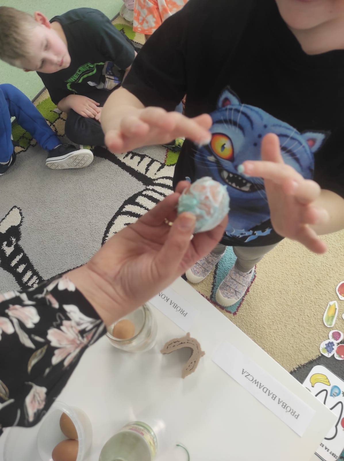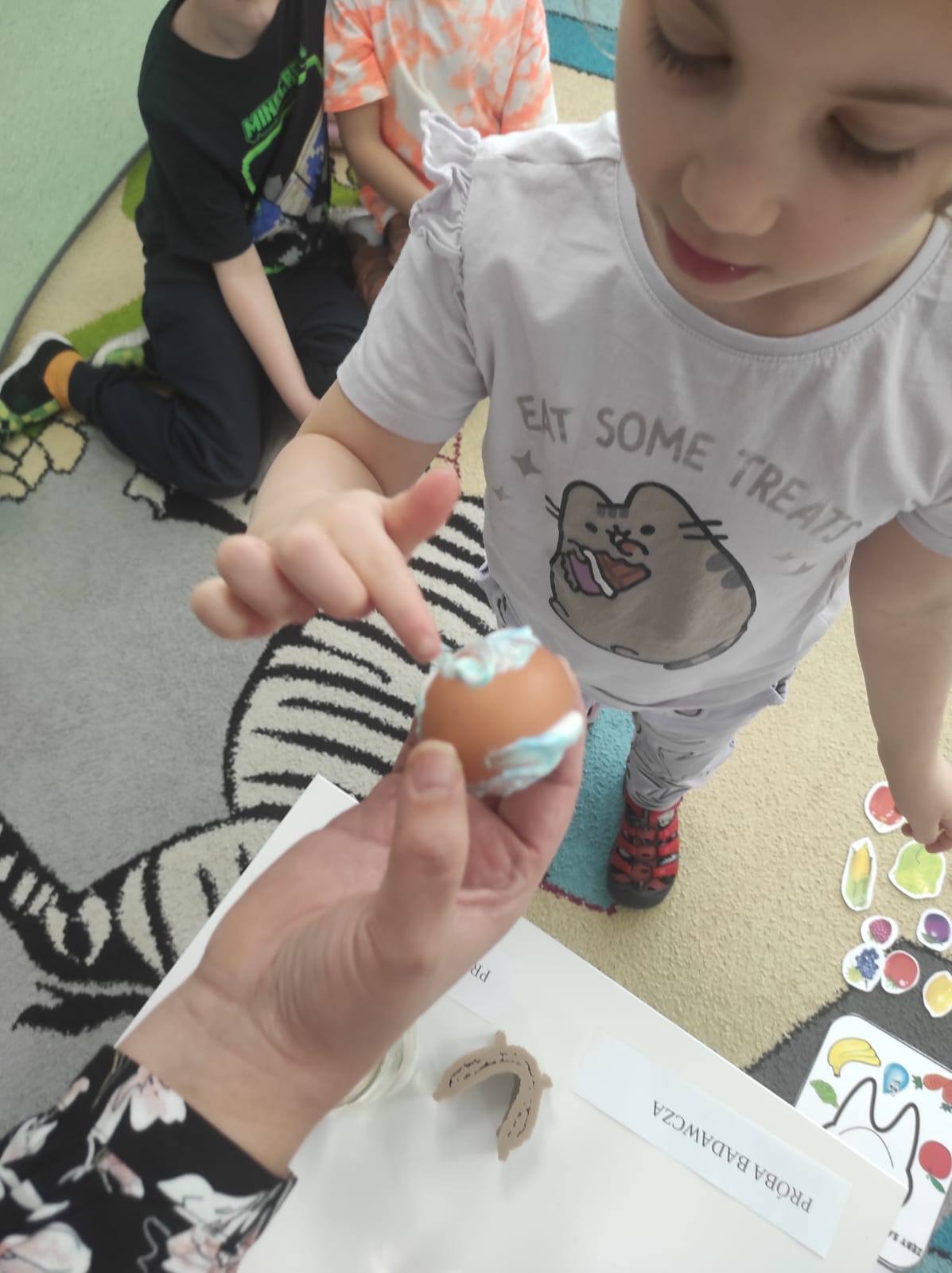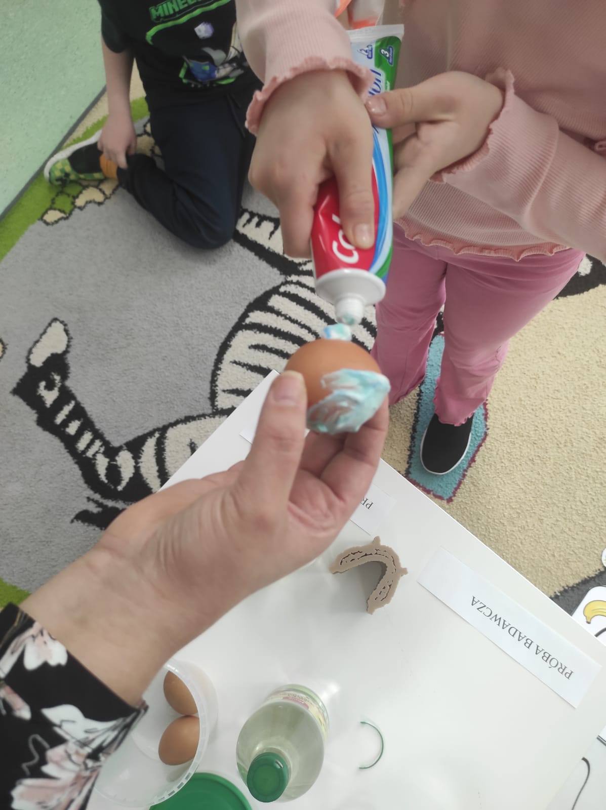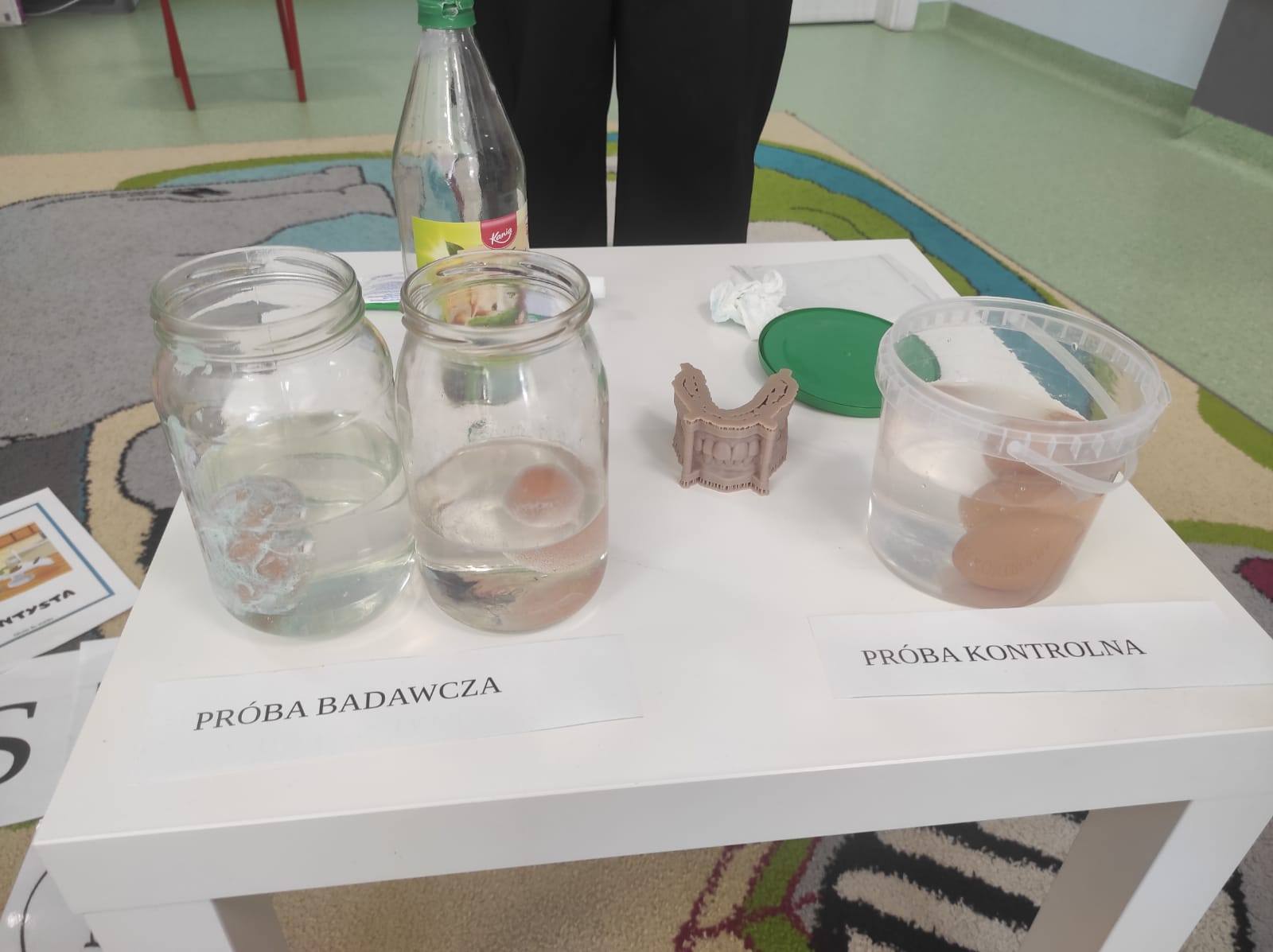 ,,Jajko w pancerzu - jak pasta chroni zęby". Dzieci miały okazję to sprawdzić na własne oczy. Skorupka jajka jest bardzo podobna budową do naszego szkliwa, więc przy wykorzystaniu jajek, pasty do zębów oraz octu przeprowadziliśmy ów eksperyment. Pasta zadziałała na jajko jak tarcza neutralizująca działanie kwasu, podczas gdy drugie jajko bez ochrony w occie zaczęło rozpuszczać skorupkę.