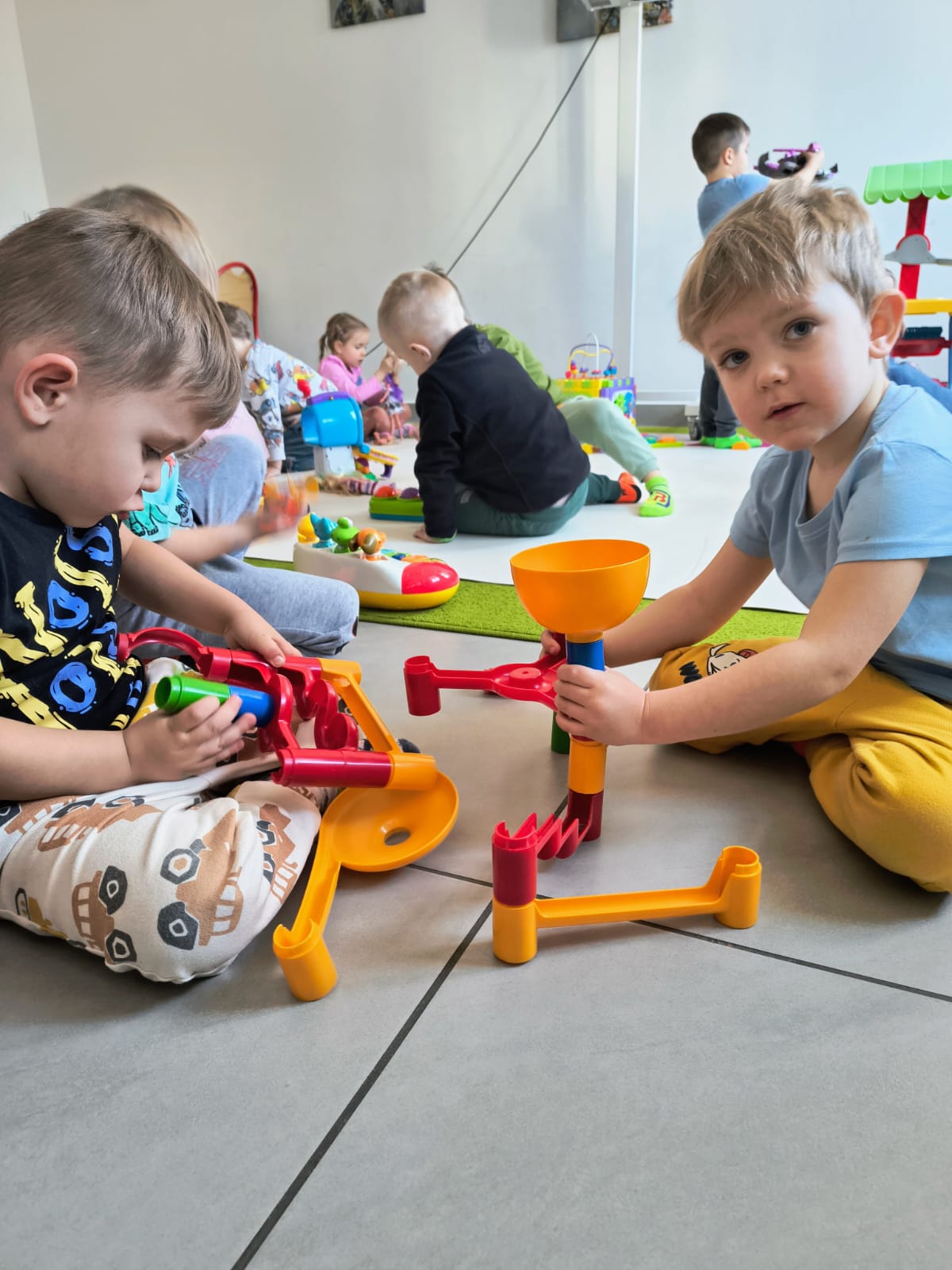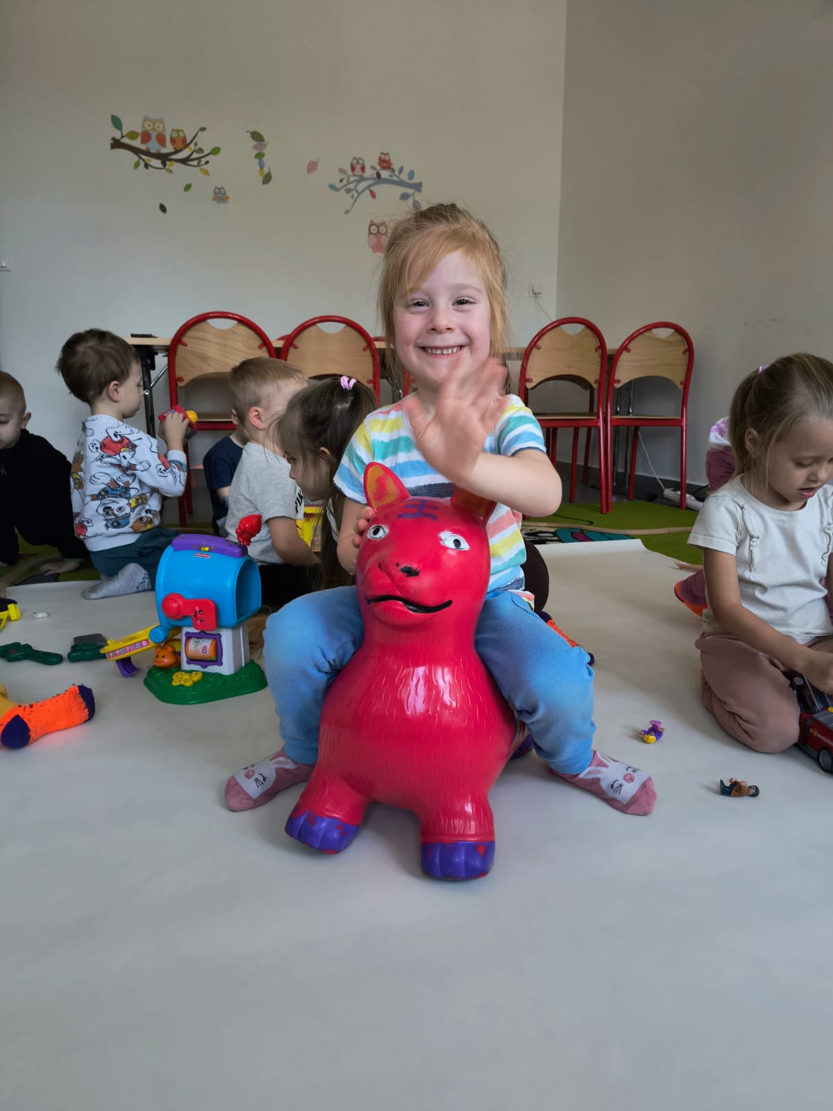 Grupy Skrzatów i Jagodek z nieskrywaną radością oddały się zabawom w małpim gaju. Pływały w basenie, gdzie wcale nie było wody. ;), łapały na podłodze balony, rybki, - był nawet Cliford - wielki czerwony pies :p , a także oddawały się twórczości plastycznej.