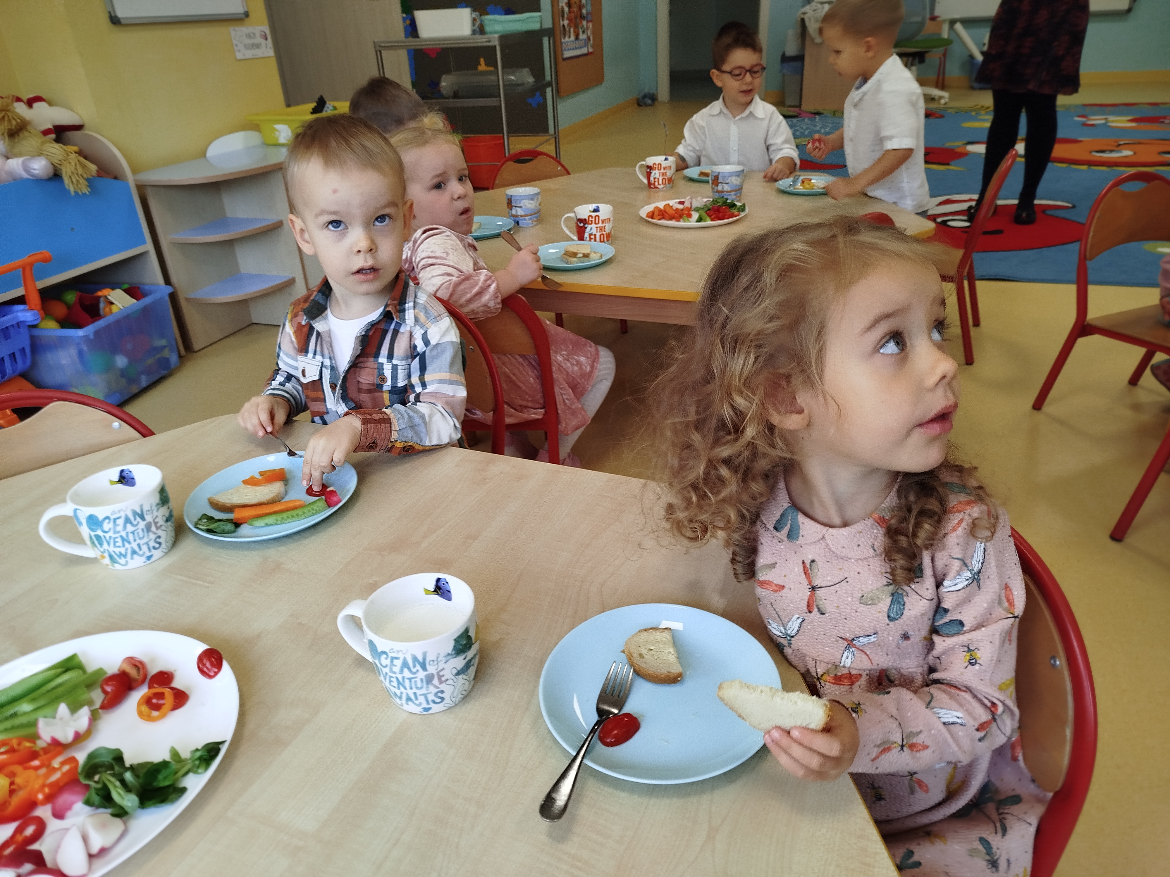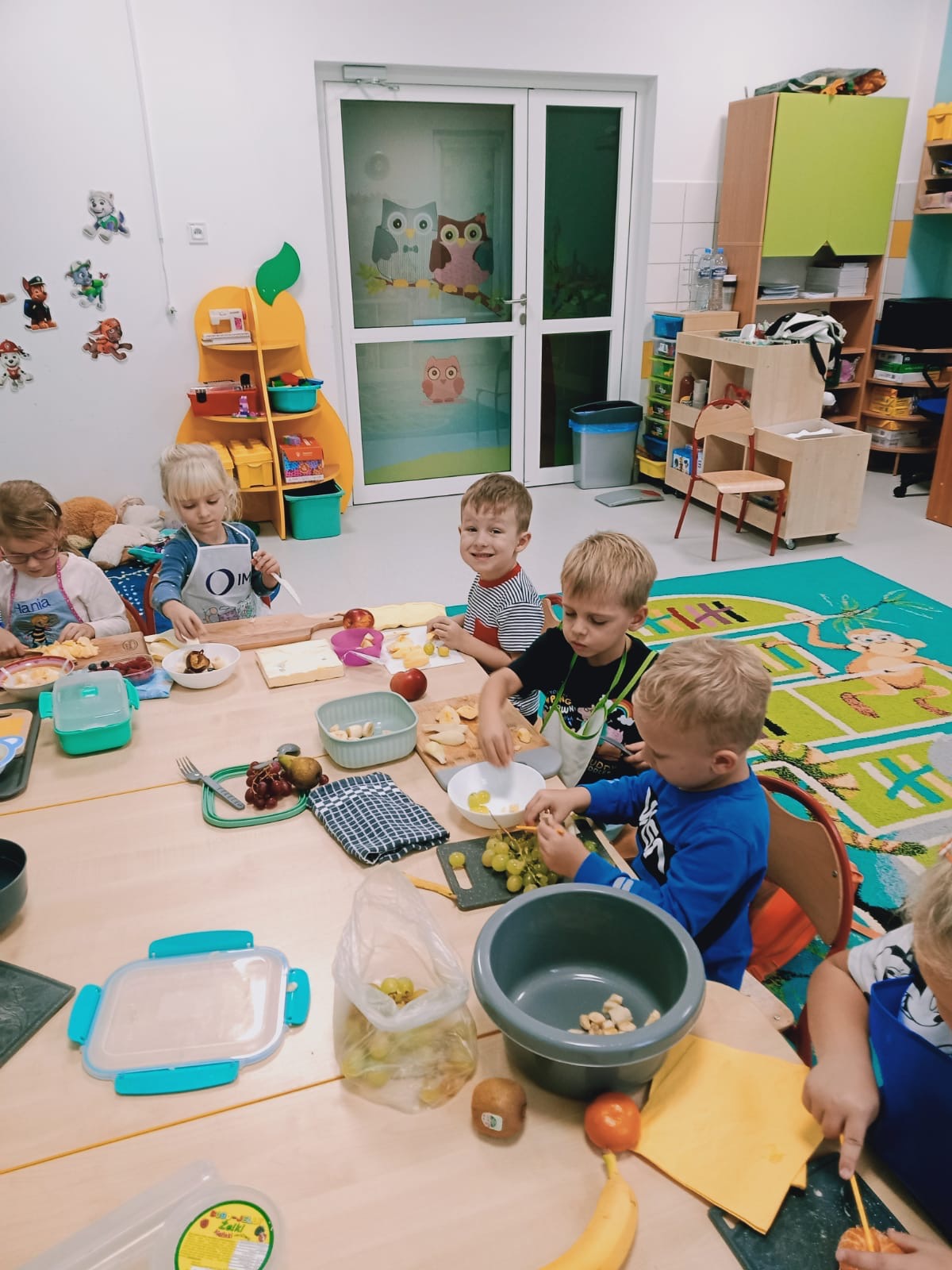 Wczoraj był dzień owoców i warzyw. Jeden z tych nietypowych dni, ale istotnie przypominających o tym, jak ważne jest zdrowe jedzonko, i obecność w posiłkach warzyw i owoców. Przedszkolaki zaczęły zatem dzień doskonale :) - od śniadania, na którym mogły próbować rozmaitych warzyw, nawet tych, które na co dzień spotykają się od razu z "nie" ;) . Kolorowo i samodzielnie.