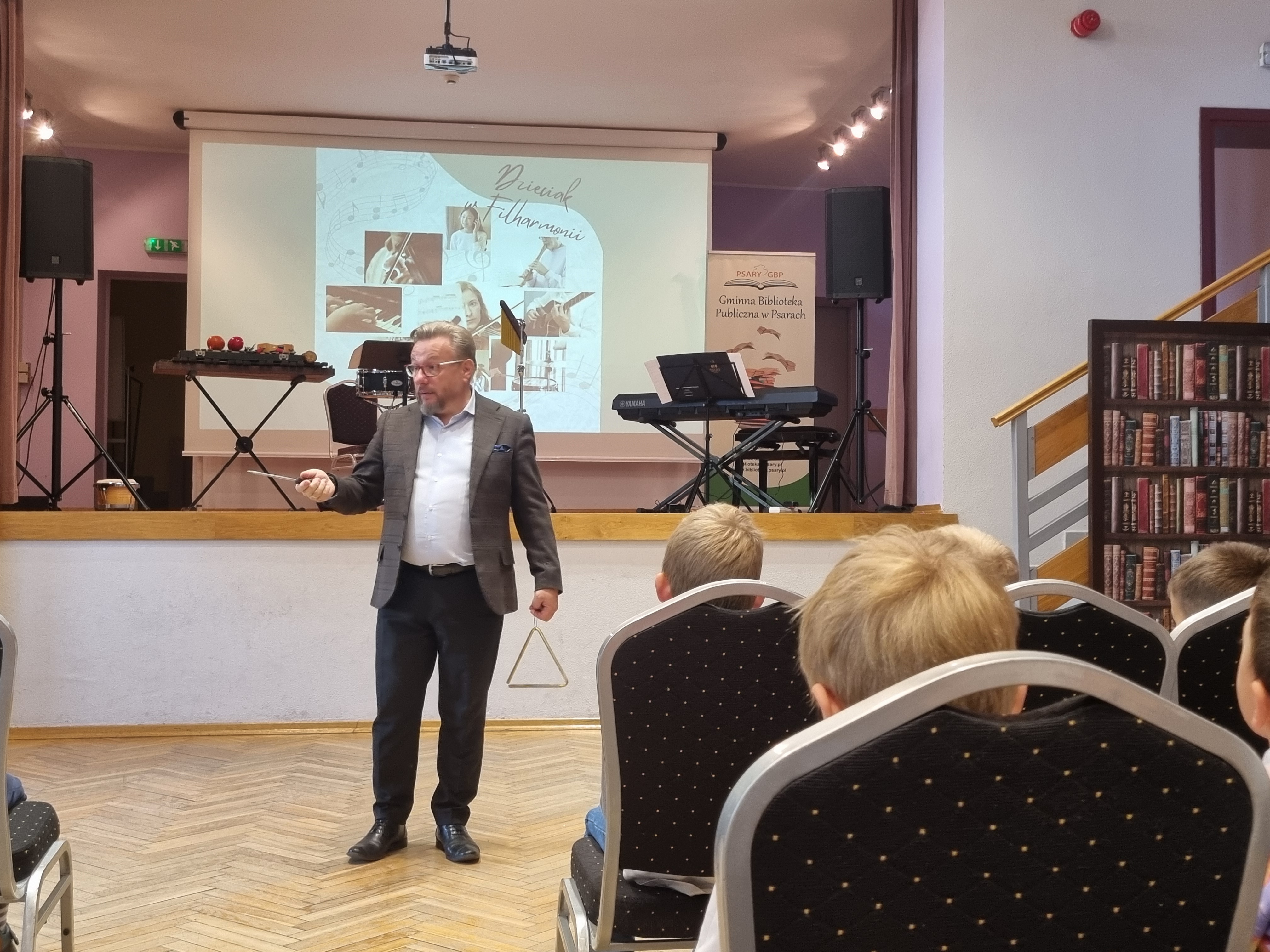 21. 10.2024r. nasze przedszkolaki z grupy Sówek i Skrzatów, rozpoczęły cykl spotkań w ramach „Szkolnej filharmonii” Odbywać się one będą w Gminnej Bibliotece Publicznej w Psarach. Na pierwszym spotkaniu dzieci dowiedziały się jak zachować się w filharmonii, zapoznały się z rodziną instrumentów perkusyjnych takich jak( trójkąt, kastaniety, werbel, tamburyn, bongosy, dzwonki i inne) Dzieci z wielkim zainteresowaniem słuchały ciekawostek na temat instrumentów z uwagą i zaciekawieniem słuchały dźwięków, jakie wydają przedstawiane instrumenty, oraz melodii i piosenek na nich granych. Całość wydarzenia prowadzi pan Oskar Jasiński, gośćmi premierowego spotkania byli: dyr. Szkoły Muzycznej w Rudzie Śląskiej Mirosław Krause oraz perkusista Piotr Lipiński. Przedszkolakom podobało się pierwsze spotkanie, bardzo aktywnie w nim uczestniczyli, na kolejne spotkanie mają nauczyć się piosenki o instrumentach perkusyjnych.
