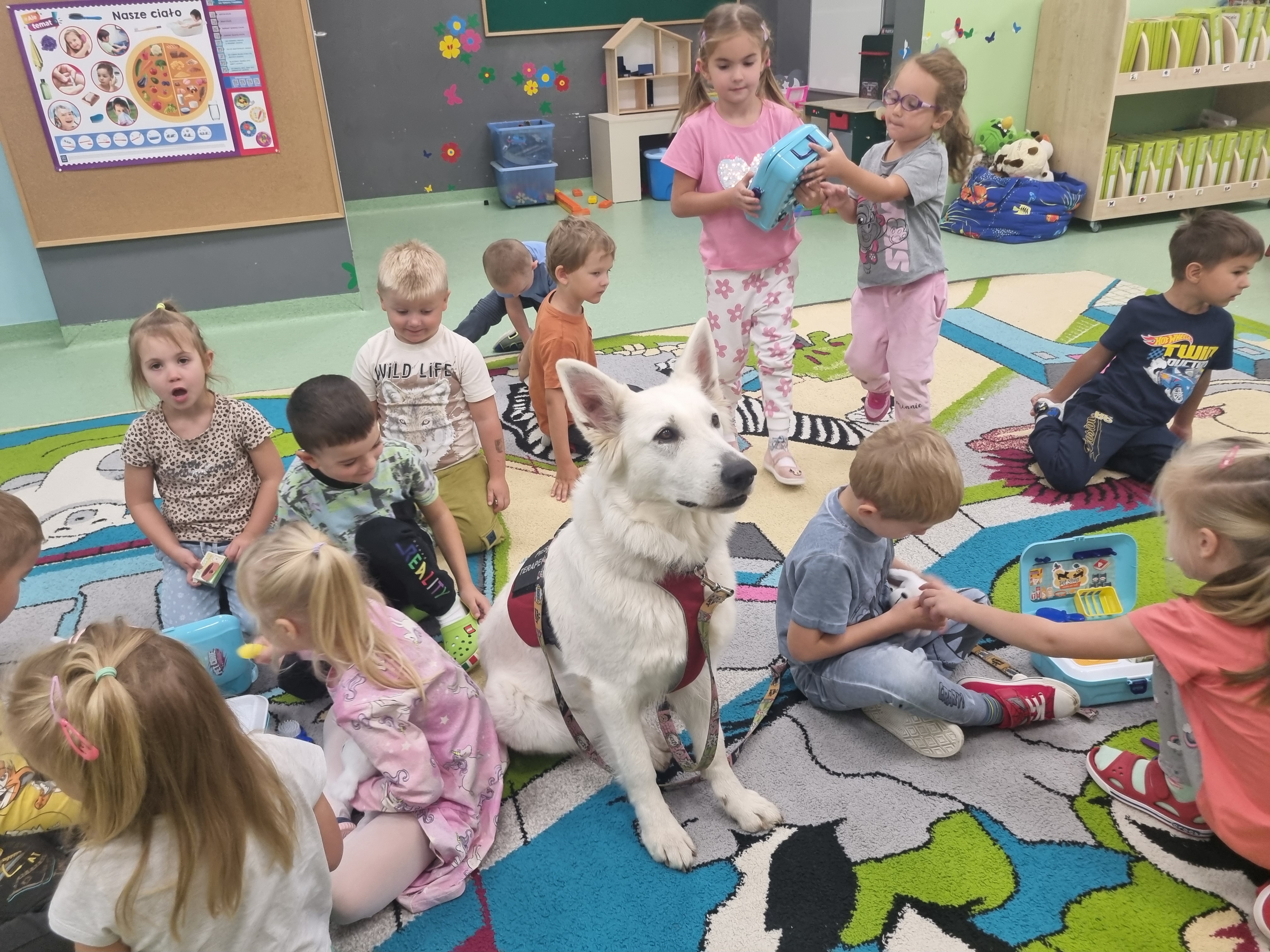 W środę 2 października nasze przedszkole odwiedził pies terapeutyczny Alaska wraz ze swoją opiekunką. Przedszkolaki zostały zapoznane z pieskiem oraz dowiedziały się jak należy zachować się w obecności psa. Treserka Alaski przeprowadziła zabawy edukacyjne dotyczące opieki i pielęgnacji psów. Dzieci chętnie współpracowały ze sobą podczas zabaw w psiego fryzjera . Zabawom bacznie przyglądał się nasz czworonożny gość, który swoim psim nosem sprawdzał każdy etap pielęgnacji.
