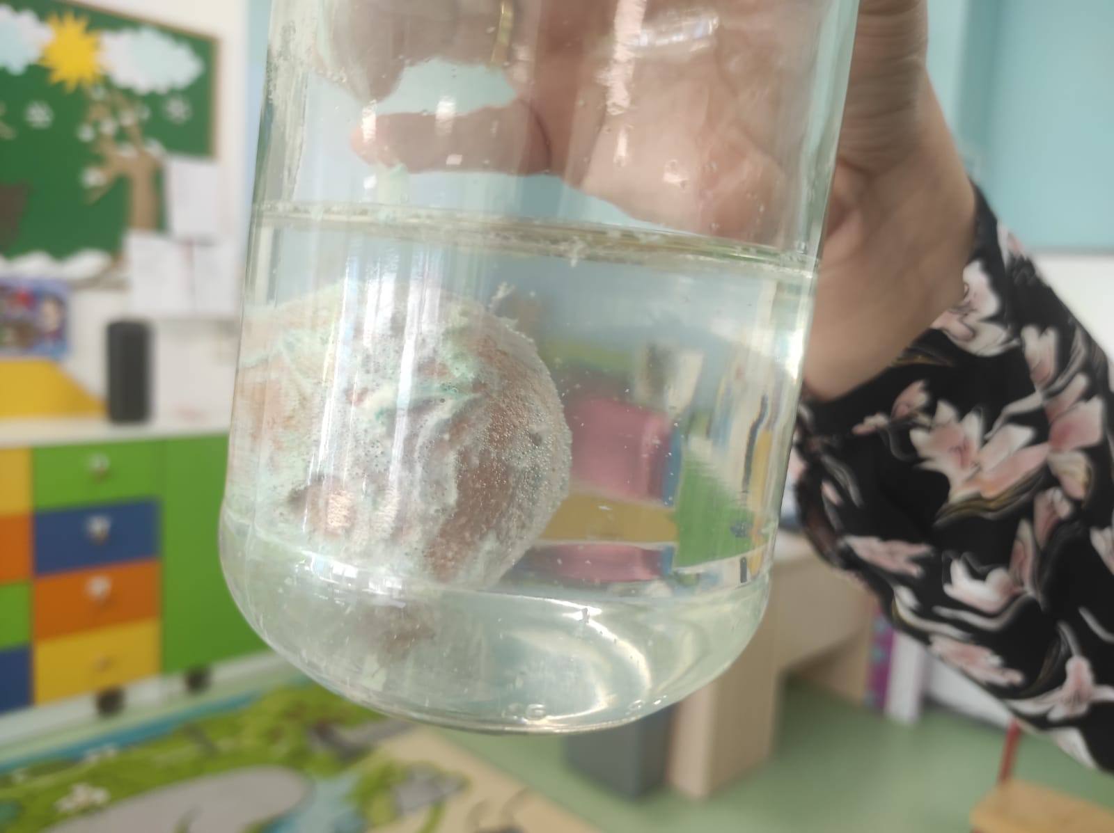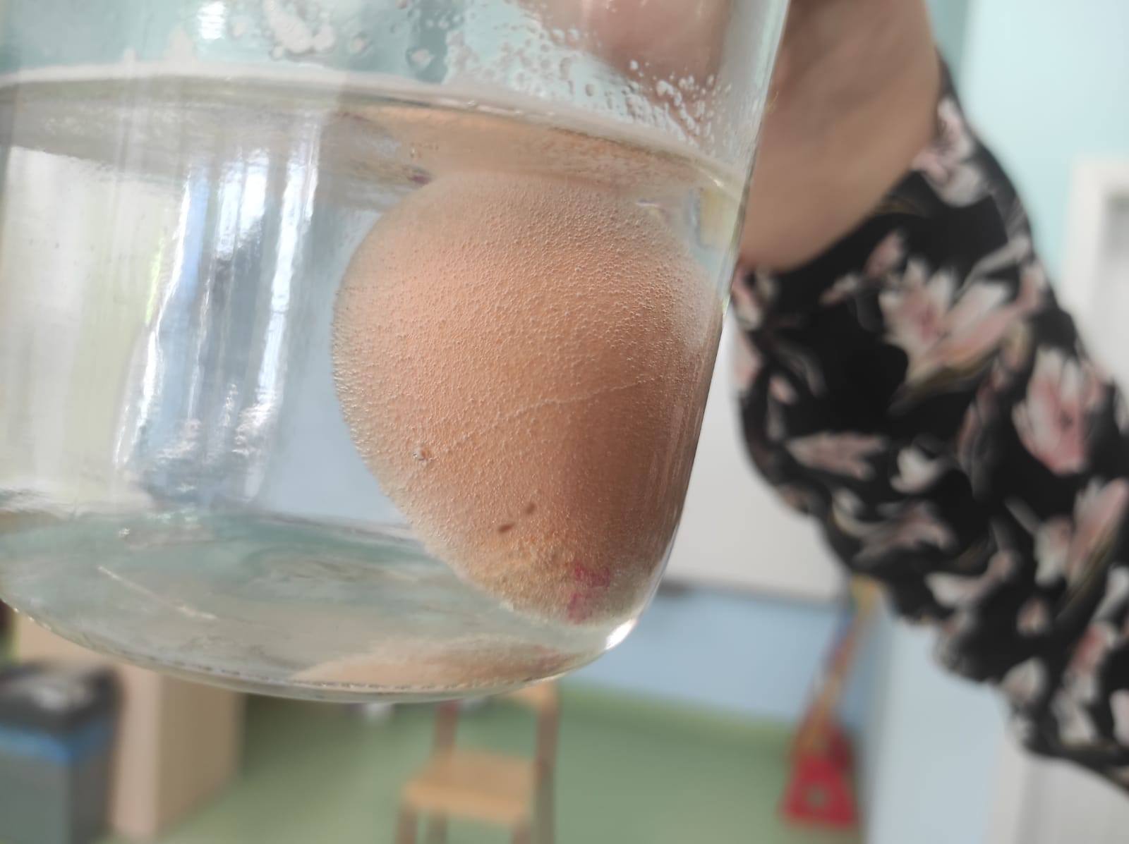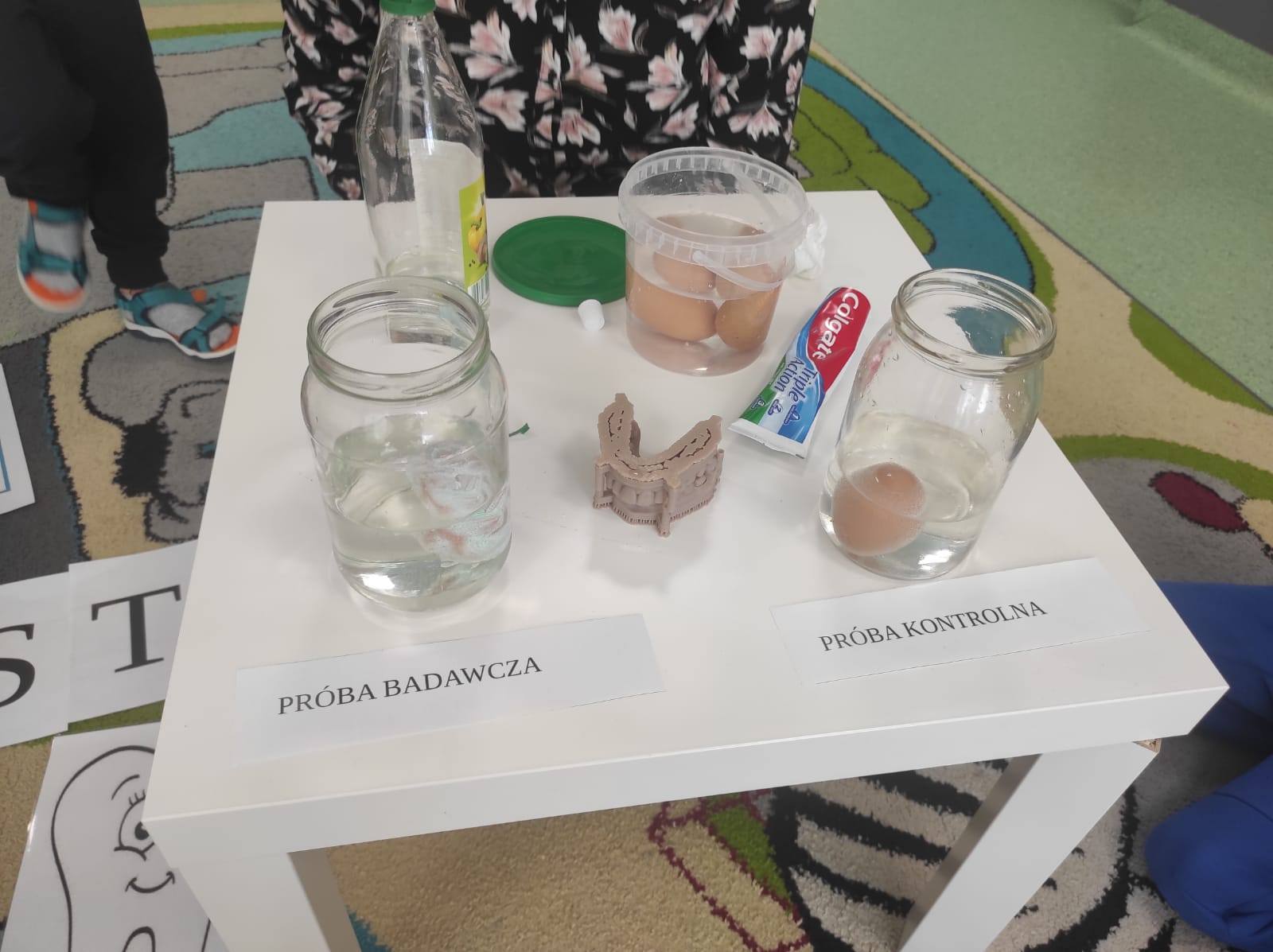 ,,Jajko w pancerzu - jak pasta chroni zęby". Dzieci miały okazję to sprawdzić na własne oczy. Skorupka jajka jest bardzo podobna budową do naszego szkliwa, więc przy wykorzystaniu jajek, pasty do zębów oraz octu przeprowadziliśmy ów eksperyment. Pasta zadziałała na jajko jak tarcza neutralizująca działanie kwasu, podczas gdy drugie jajko bez ochrony w occie zaczęło rozpuszczać skorupkę.