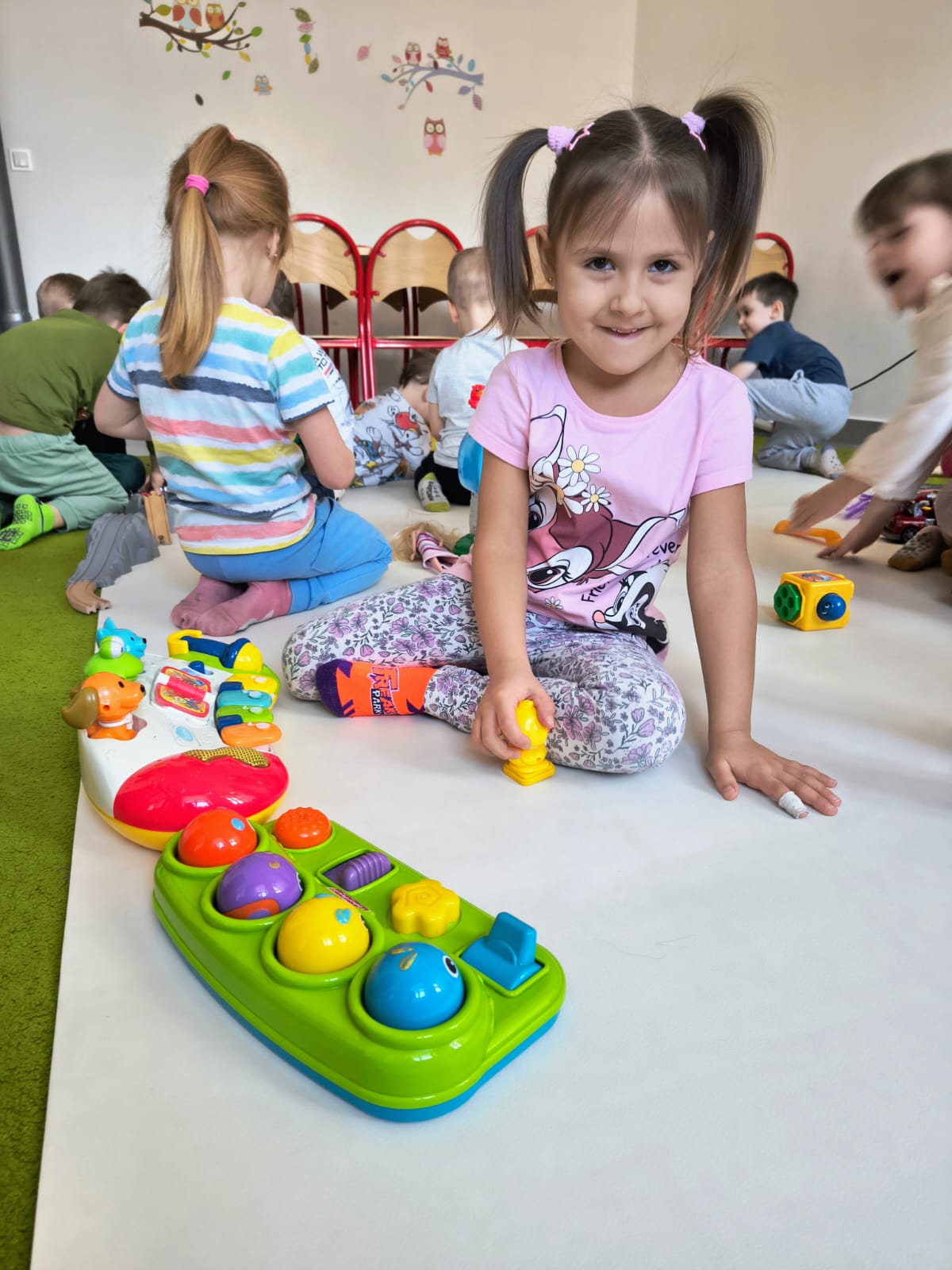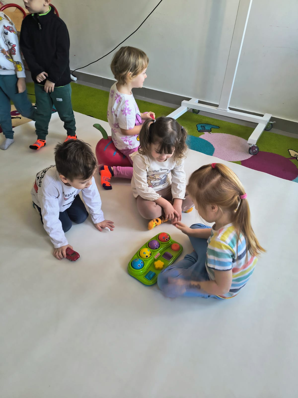 Grupy Skrzatów i Jagodek z nieskrywaną radością oddały się zabawom w małpim gaju. Pływały w basenie, gdzie wcale nie było wody. ;), łapały na podłodze balony, rybki, - był nawet Cliford - wielki czerwony pies :p , a także oddawały się twórczości plastycznej.